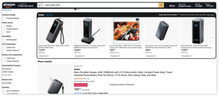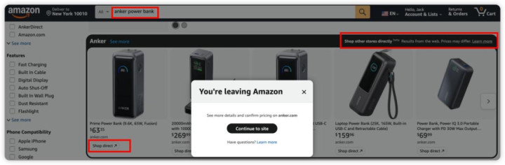 以“anker power bank”为例,当用户在搜索框输入该关键词,结果页除了显示Anker在亚马逊站内的充电宝链接(listing),还会出现一个独立的模块。该模块内每个商品的下方,有一个“Shop Direct”的按钮。