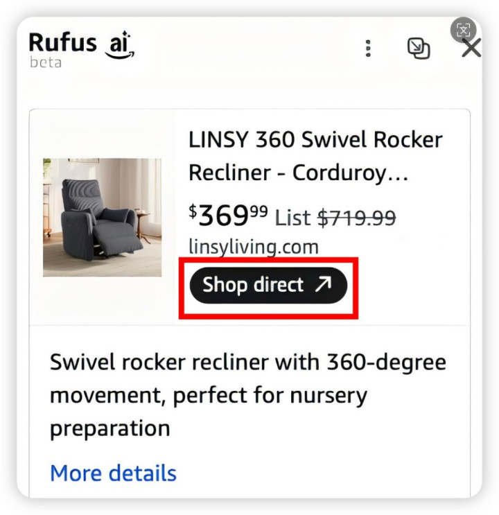 图/Rufus推荐的某个产品,带有“Shop Direct”的按钮
