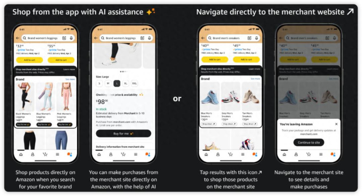 在“Shop Direct”模式下,需要离开亚马逊页面,跳转至品牌官网,进行手动购买。而在“Buy for me”模式下,用户始终停留在亚马逊页面内,由亚马逊AI助手代为购买,由其自动跳转至目标独立站,将产品添加到购物车,填写收货信息和支付等动作,而用户无需跳转至独立站。