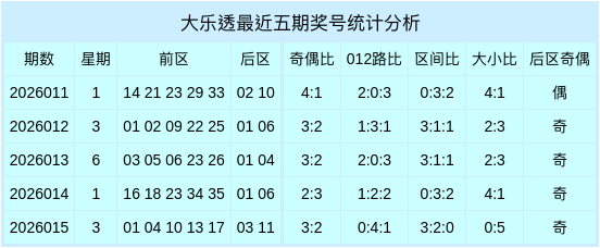 大乐透第2026015期开奖,前区:01、04、10、13、17;后区:03、11。其中前区012路比为0:4:1,后区开出“0路+2路”组合号码。